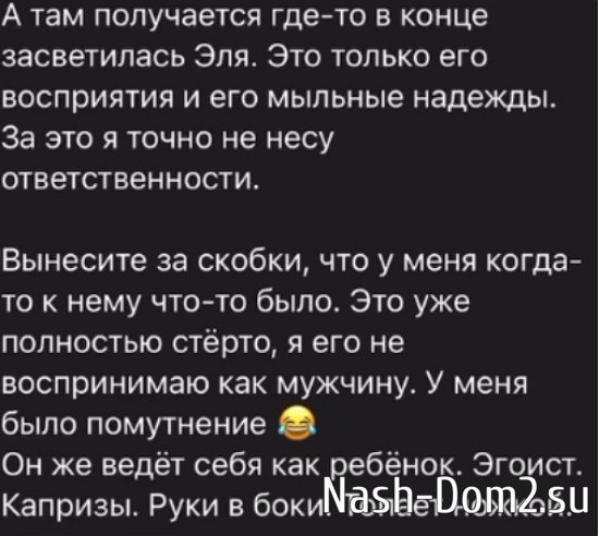 По словам Черно, она правда не досмотрела ролик до конца и отправила его Диме, который и «слил» видео в сеть. Девушка пыталась помириться с Элиной, но она непреклонна и считает, что Саша всё сделала специально, «в крысу». Рахимова точно справится с критикой коллег, она уже привезла на поляну нового парня с клуба, с которым целовалась, а вот Овсянникову теперь долго будут «чехвостить» за её поведение.